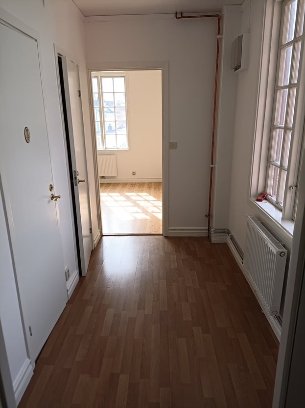 När du kliver in möts du av en hall med badrummet direkt till vänster – helkaklat och utrustat med dusch samt en kombinerad tvättmaskin/torktumlare. Köket ligger rakt fram och har fönster mot innergården samt gott om ljus. Här finns spis, kyl/frys och diskmaskin. Golvet är ljust och lättstädat, medan angränsande rum har trägolv.