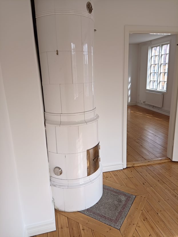 Sovrummet har vackert trägolv och ljusinsläpp från två håll. I ena hörnet står en av kakelugnarna – en vacker inredningsdetalj som ger rummet extra charm. Från sovrummet når du det stora vardagsrummet med stora fönster, trägolv och ännu en kakelugn som bidrar till rummets inbjudande atmosfär.
